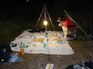 Como se faz: Lençol branco no chão, para ser mais fácil detectar as borboletas. Um apoio para a lâmpada, copos para a captura facilitando a contagem e identificação, depois são libertadas ……